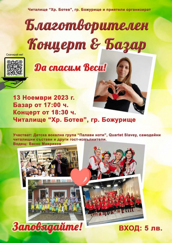 Читалище „Христо Ботев“, гр. Божурище и приятели организират благотворителен концерт и базар „Да спасим Веси“. Благотворителното събитие ще се проведе на 13 ноември, в читалището. Базарът е с начален час 17.00 ч., а концертът ще започне в 18.30 ч. Участие ще вземат: Детска вокална група „Палави ноти“, Quartet Slavey, самодейни читалищни състави и други гост-изпълнители. Водещ ще бъде Васко Мавриков. Входът за концерта е 5 лв.