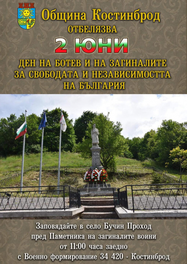 Честването, организирано от Община Костинброд, ще се проведе на 2 юни, от 11:00 ч. пред Паметника на загиналите за свободата от с. Бучин проход, с участието на военно формирование формирование 34 420 - Костинброд.