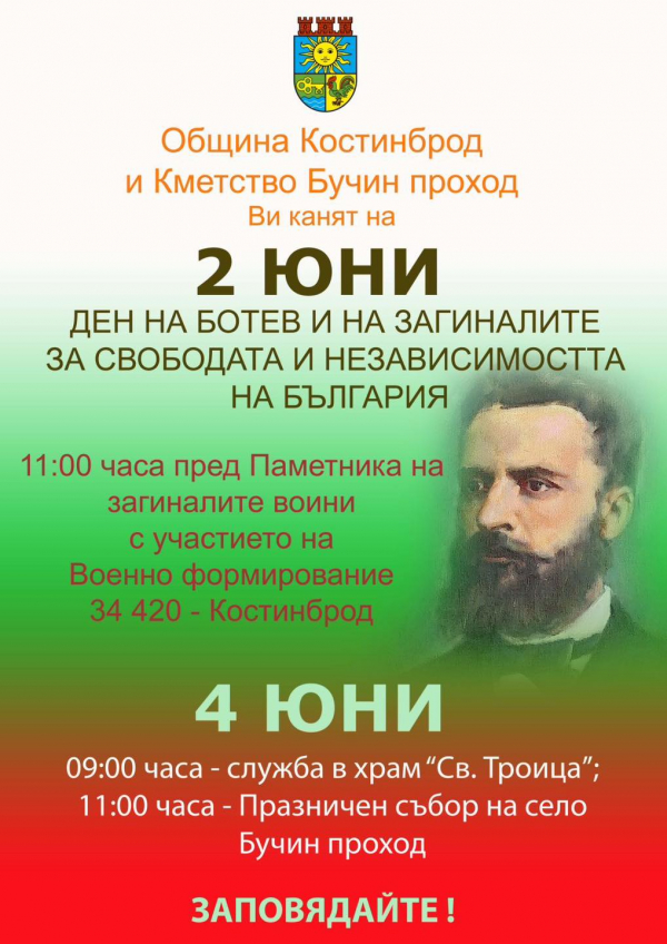 Честването, организирано от Община Костинброд, ще се проведе на 2 юни, от 11.00 ч. пред Паметника на загиналите за свободата от с. Бучин проход, с участието на военно формирование формирование 34 420 - Костинброд.
