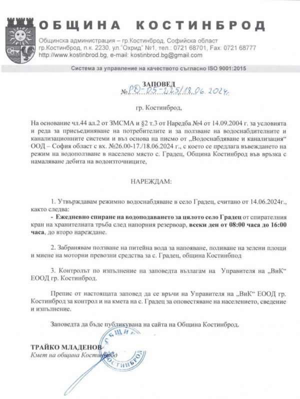 Във връзка със силно намаления дебит на водоизточниците на с. Градец и писмо от „Водоснабдяване и канализация“ ООД – София област, с вх. № 26.00-17/18.06.2024 г., кметът на Община Костинброд издаде заповед РД 05-225/18.06.2024 г. с която се налага ограничен режим за водоползване в селото.