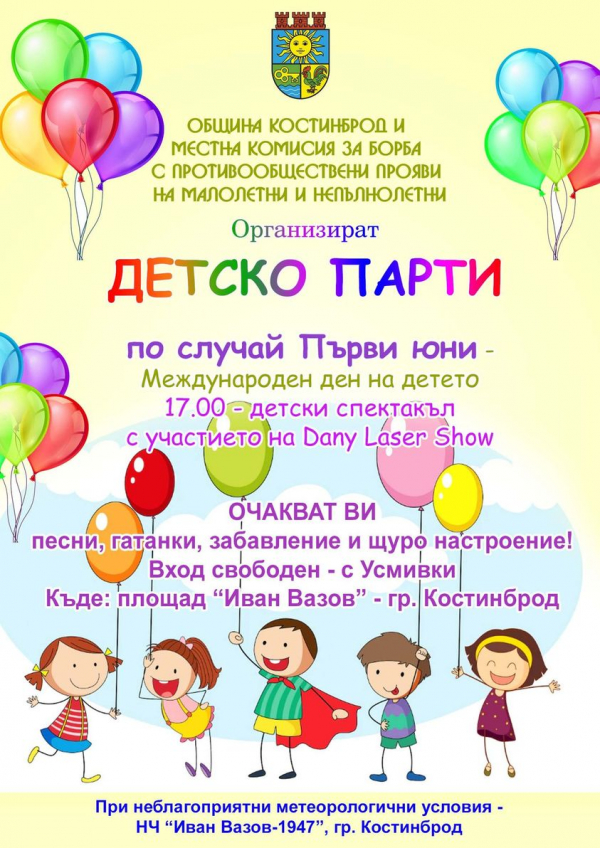 В Деня на детето, Община Костинброд и Местна комисия за борба срещу противообществените прояви на малолетни и непълнолетни, ще зарадват най-малките жители на общината със специално детско парти, много игри и забавляния. Мястото е площад „Иван Вазов“, началния час на празника е 17.00 ч.
