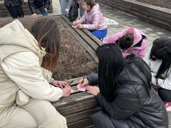 С много ентусиазъм и вдъхновение те написаха своите послания срещу агресията върху розови хартиени фланелки и ги закачиха на площад „Иван Вазов“, превръщайки го в символ на добротата и разбирателството.