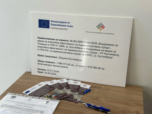 На 18 декември, в Информационнен център, град Костинброд, се проведе откриваща пресконференция за представяне на проект с № BG-RRP-4.020-0036 „Внедряване на мерки за енергийна ефективност на Административна сграда – Пожарна в УПИ VI -2689, гр. Костинброд и Внедряване на мерки за енергийна ефективност на Административна сграда – РУ Костинброд в УПИ XVI, за административна сграда на НАПС, гр. Костинброд“, финансиран чрез Национален план за възстановяване и устойчивост по процедура с № BG-RRP-4.020 „Подкрепа за устойчиво енергийно обновяване на публичен сграден фонд за административно обслужване, култура и спорт“ на Министерство на регионалното развитие и благоустройството.