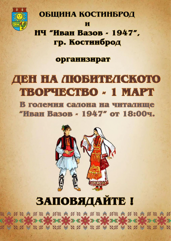 По повод Деня на самодееца и любителското художествено творчество, който отбелязваме на 1-ви март, Община Костинброд и НЧ „Иван Вазов 1947“ ще подарят на костинбродчани празничен концерт.