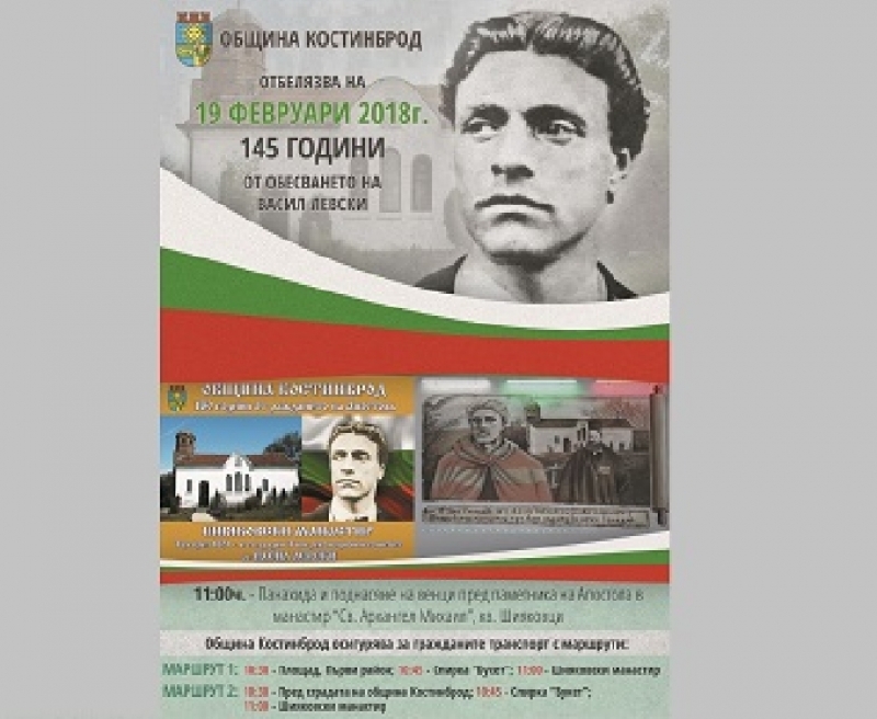 Община Костинброд ще отбележи 145 години от обесването на Васил Левски. Церемонията ще се проведе при Шияковския манастир „Св. Архангел Михаил“ на 19 февруари и ще започне в 11:00 часа, информират от местната администрация.