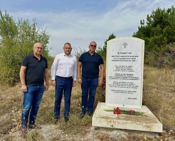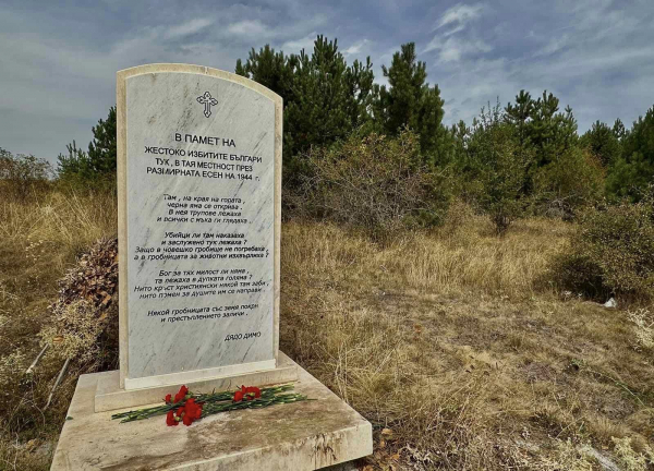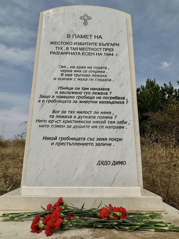 В ПАМЕТ НА ЖЕСТОКО ИЗБИТИТЕ БЪЛГАРИ ТУК, В ТАЯ МЕСТНОСТ ПРЕЗ РАЗМИРНАТА ЕСЕН НА 1944 Г.