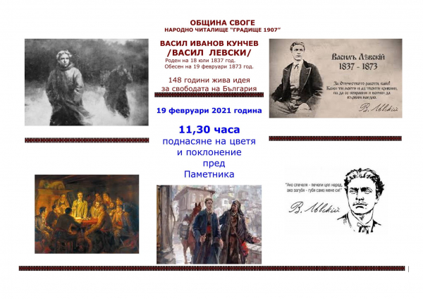 Община Своге и НЧ „Градище 1907“ ще почетат живота и делото на Васил Левски с поднасяне на цветя и венци на площада пред паметника на Апостола в Своге.