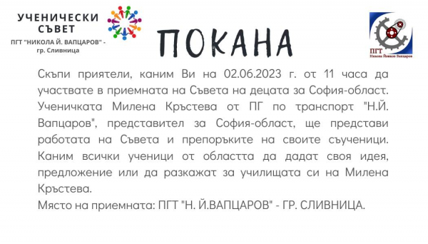 Сливнишката ПГТ „Н. Й. Вапцаров“ ще бъде домакин на открита приемна на Съвета на децата за София област. Приемната ще се проведе на 2 юни /петък/ от 11.00 ч. Възпитаничката на гимназията в Сливница, Милена Кръстева, което е представител на Съвета на децата за София-област, ще представи работата на Съвета и препоръките на своите съученици.