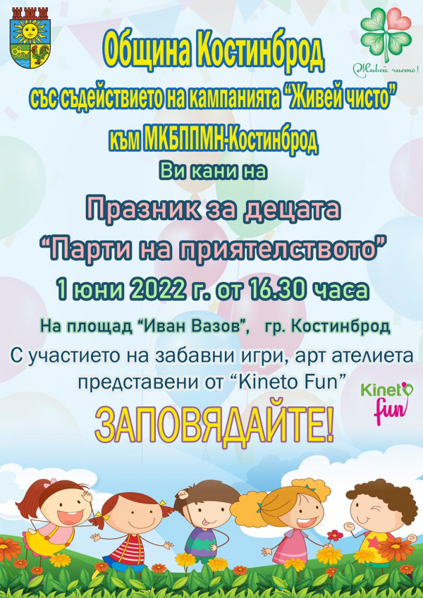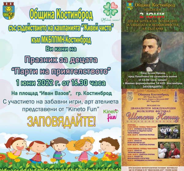 В празничния ден, Община Костинброд, съвместно с кампанията „Живей чисто“ към МКБППМН и Парти агенция „Kineto fun“ ще зарадват най-малките жители на община Костинброд много игри, Арт ателиета и томбола с награди.