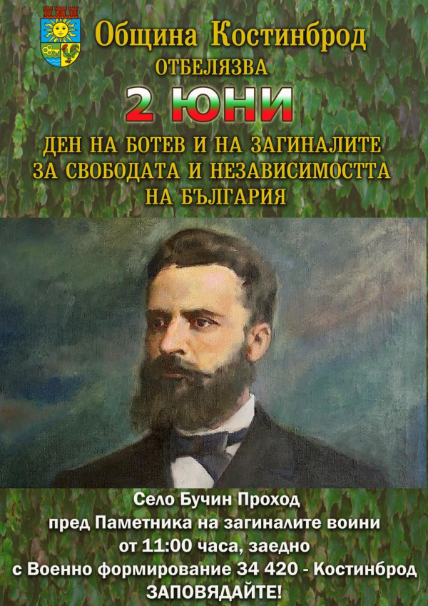 На 2 юни, в село Бучин проход ще почетат Ботев и загиналите за свободата и независимостта на България. Честването, организирано от Община Костинброд, ще се състои от 11.00 ч. пред Паметника на загиналите войни. Участие ще вземе и Военно Формирование 34 420 – Костинброд.