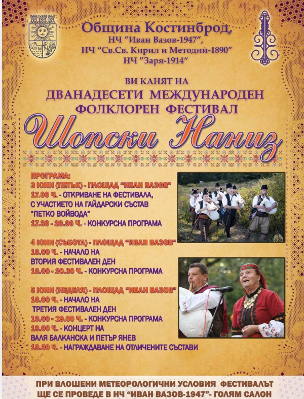 На 3, 4 и 5 юни, на пл. „Иван Вазов“, в Костинброд ще се проведе тридневния Международен фолклорен фестивал „Шопски наниз“.