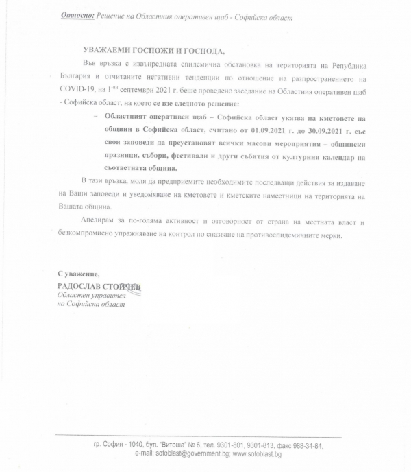 Във връзка с взети решения на Областния оперативен щаб - Софийска област и усложнената епидемична обстановка, с оглед запазване живота и здравето на гражданите в община Костиброд се преустановяват всички масови мероприятия. За това информират от Общината.