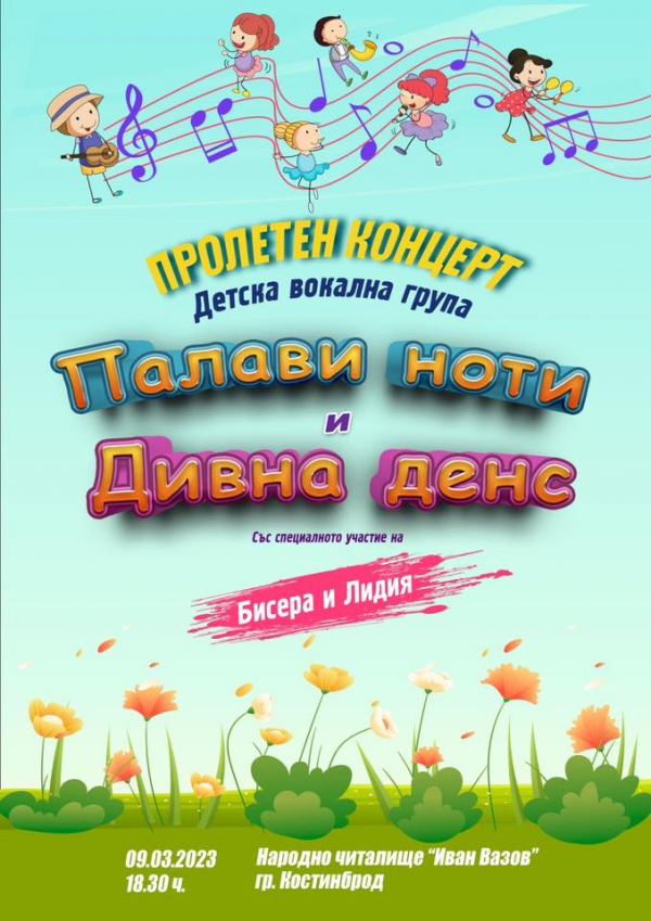 Музикалното събитие ще се проведе в НЧ „Иван Вазов1947“, гр. Костинброд на 9 март, от 18.30 ч. и в него ще вземат участие ДВГ „Палави ноти“ с художествен ръководител Венелина Миланова, ТФ „Дивна денс“ с художествен ръководител и Емилия Димитрова и народните певици Бисера и Лидия. Входът за събитието е на цена 5 лв.