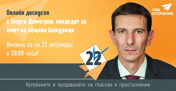 Георги Димитров, кандидат за кмет на община Божурище от ПП „Нова алтернатива“, ще проведе онлайн дискусия с избирателите от общината.