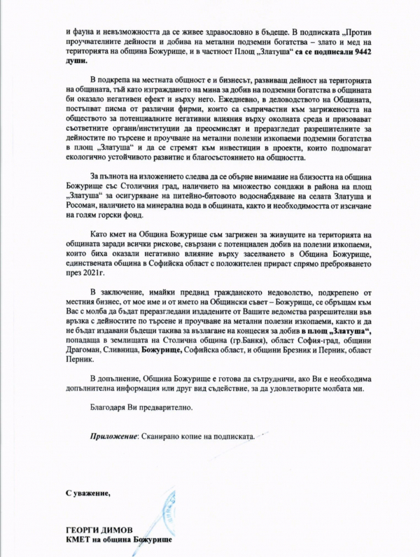 "Днес, 08.04.2024 г., входирахме писмо до всички компетентни институции по повод нежеланието на жителите на община Божурище, за развитието на проучвателни сондажи и реализацията на мина за добив на злато в площ Златуша! Към писмото приложихме и събраната подписка с 9442 фигуриращи подписа в нея, както и писма изразяващи недоволството от страна на местния бизнес!", съобщи кметът на община Георги Димов.