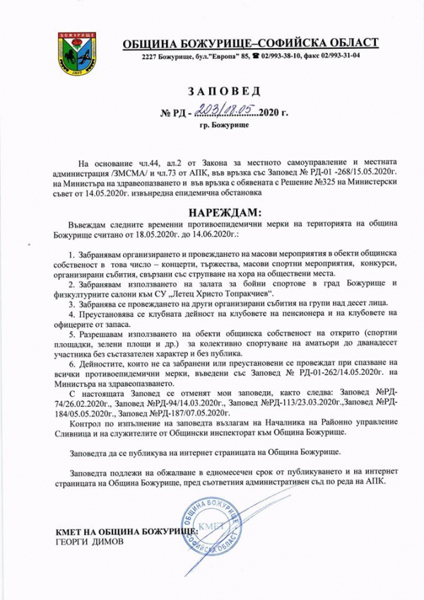 "Във връзка с обявената извънредна епидемична обстановка и заповеди, издадени от министъра на здравеопазването, Ви запознавам с моя заповед за въвеждане на временни противоепидемични мерки за община Божурище, в рамките на правомощията ми.