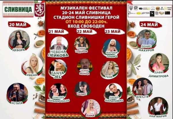 Голям музикален фестивал ще се проведе в Сливница в периода 20-24 май. На стадион "Сливнишки герой" ще се изявят големи български изпълнители в различни стилове. Веселин Маринов, Неда Украден, 100 Кила, Енчев, Рени, Орхан Мурад, Димитрис Пападополус са сред имената, които ще участват в празника, пише balkanec.bg.