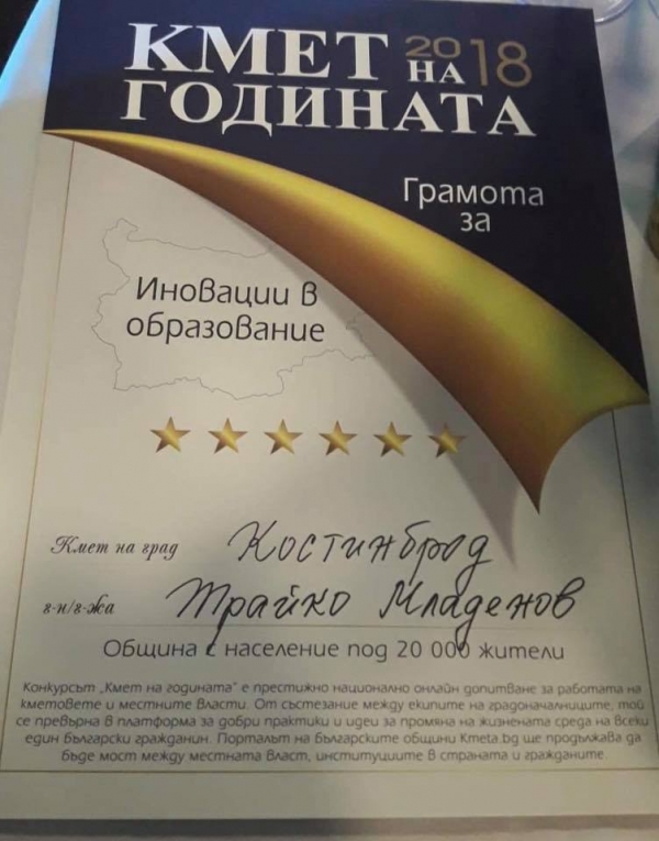 Трайко Младенов – кмет на община Костинброд, спечели надпреварата сред малките общини в категория „Иновации в образование“.
