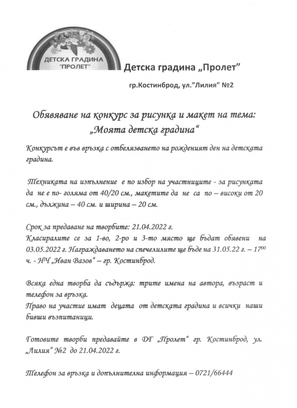 По повод своята 40-годишнина, ДГ „Пролет“, Първи район, гр. Костинброд обявява конкурс за рисунка и макет на тема: „Моята детска градина“.