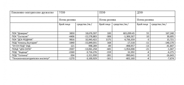 Две дружества са на плюс от прехвърлянето, и в трите вида фондове - ПОК „ДСК-Родина“ и ПОК „Доверие“, като общия положителен резултат е съответно с над 37 млн. лв. за „ДСК-Родина“ и над 19 млн. лв. за „Доверие“. С малко над 450 хил. лв. общ положителен резултат е и ПОД „НН“, а всички останали дружества са на минус.