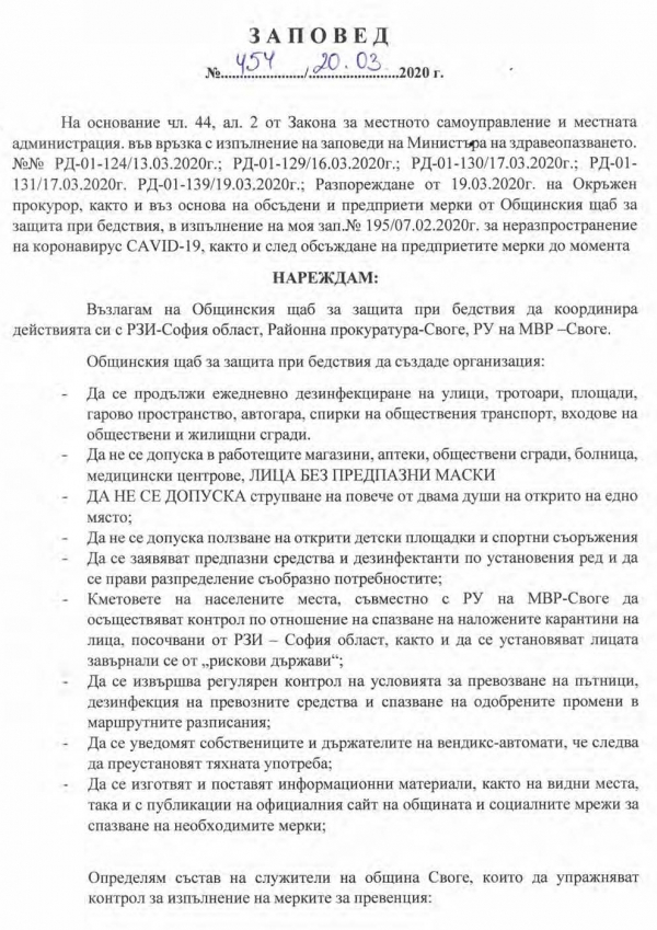 На основание чл. 44, ал. 2 от Закона за местното самоуправление и местната администрация, във връзкаа с изпълнение на заповеди на Министъра на здравеопазването № РД-01-124/13/03/2020г.; РД-01-130/17.03.2020г.; РД-01-131/17.03.2020; РД-01-139/19.03.2020 г.; Разпореждане от 19.03.2020 на Окръжен прокурор, както и въз основа на обсъдени и предприети мерки от Общинския щаб за защита при бедствия, в изпълнение на зап. № 195/07/02/2020 г. с цел предотвратяване на разпространение на коронавирус COVID-19, както и след обсъждане на предприетите мерки до момента, инж. Валентин Михайлов, зам. кмет на община Своге нарежда: