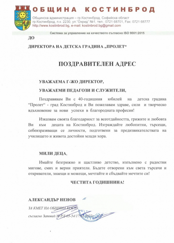 Детска градина „Пролет“, гр. Костинброд празнува своята 40 годишнина. По повод рождения ден на детското заведение, зам-кметът Александър Ненов поздрави служителите и изказа своята благодарност за всеотдайността, грижите и любовта на към децата на Костинброд.
