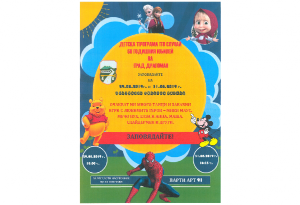 За най-малките ще има детски тържества с много танци, забавления, игри, любими герои и аниматори. „Парти Арт 91“ ще се погрижи за веселото настроение на малчуганите на 29 август от 18:00 ч. и на 31 август от 16:15 ч. Мястото е централния градски площад в Драгоман.