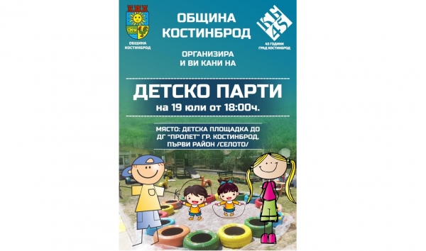 Във връзка с инициатива на родители и деца за облагородяването на детската площадка в Първи район, Oбщина Костинброд организира детско парти с аниматори, игри и забавления.