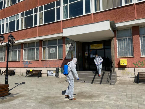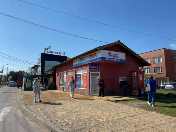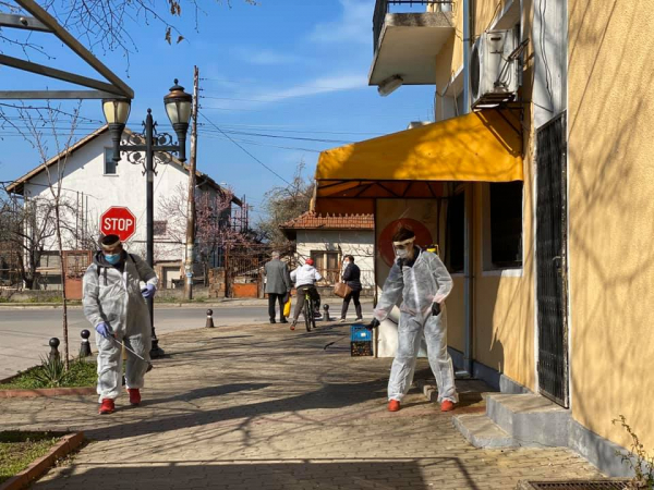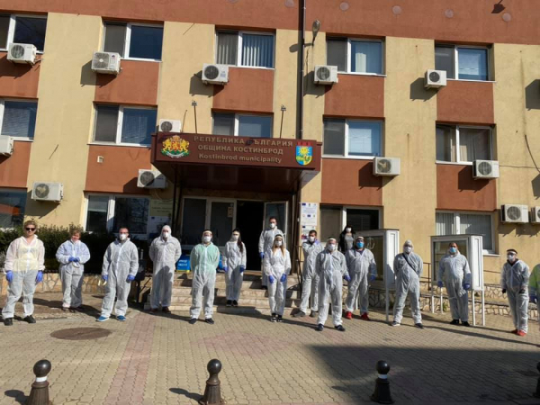 Деветнадесет доброволци, дезинфекцираха с ръчни пръскачки с Йодофор „ДЕЗИНФЕКТ В“- почистващ дезинфекционен препарат Йод-16/1000 g /1,6%/, ПАВ > = 7 %., обществени места в Костинброд.