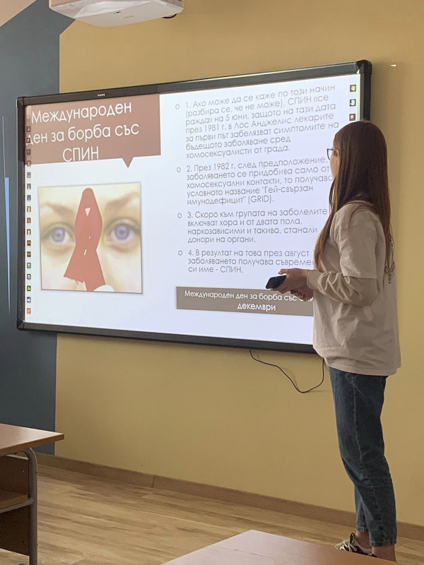 Доброволците представиха кратка презентация на тема: Световен ден за борба със СПИН, пред ученици от 7 клас от СУ „Д-р Петър Берон“, град Костинброд. Учениците научиха разберат повече информация за заболяването и неговите превенции. След представянето на информацията имаше обратна връзка, която помогна на доброволците да разберат емоциите на учениците след презентацията. Накрая бяха раздадени ръчно изработени червени панделки на учениците – символ на обединяването на усилията на хората в общата борба срещу болестта.