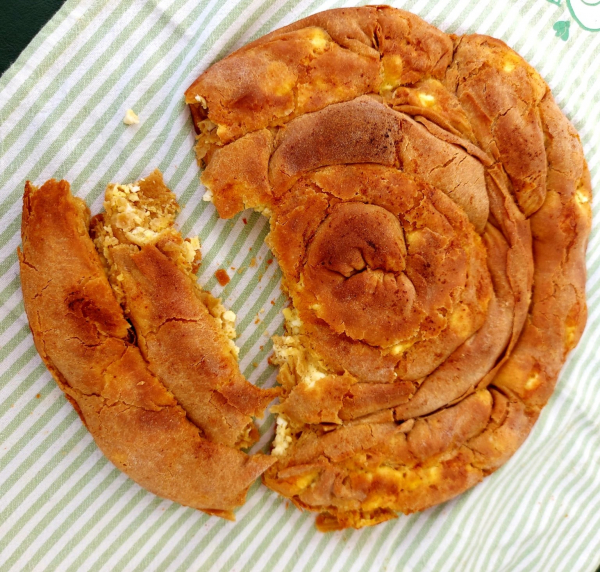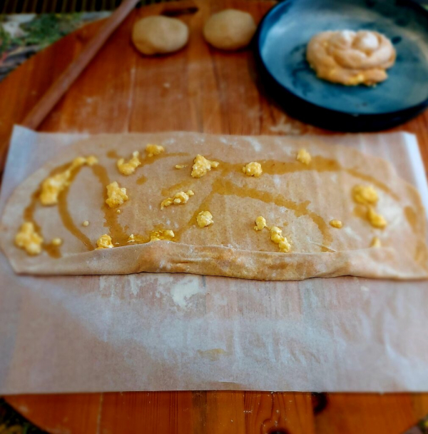Готовият лист тесто навиваме отново на точилката, повдигаме и под него поставяме широка кърпа или готварска хартия. Листът развиваме върху нея и поливаме с разтопеното масло (с лъжица) и с плънката от яйца и сирене. С помощта на кърпата навиваме кората. След което навиваме на охлюв и пренасяме в тавата.