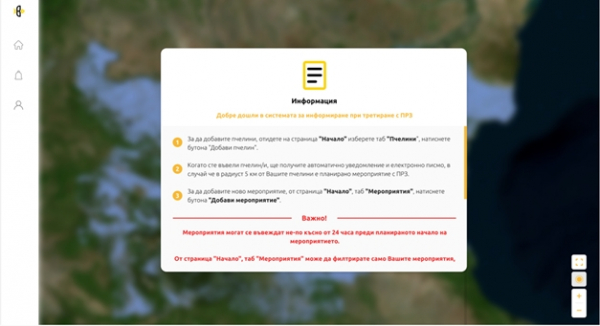 Пчеларите сами ще трябва да въвеждат GPS координатите на пчелина. Това ще става лесно с помощта на геолокация през телефона и въвеждане на данните в системата. В случай на третирания в периода до 28 февруари 2021 г. уведомяването ще се извършва по досегашния ред - лично, чрез кмета на населеното място, който обявява и разпространява информацията чрез местните средства за масово осведомяване и чрез новата електронна платформа.