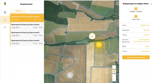 След запис на мероприятието, автоматично се изпраща e-mail и SMS до потребителите с пчелини, попадащи в радиус 3 км. около блока, който ще бъде третиран. Въведени са следните ограничения при добавяне на мероприятие: - Мероприятията се въвеждат най-рано 2 дни по-рано. - Мероприятията могат да продължават не повече от 24 часа. 1.8. Избор на пчелин. При избор на пчелин от списъка се визуализира локацията на пчелина и информация за него.