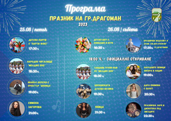 С богата музикална и развлекателна програма, Драгоман ще отбележи 54-тата годишнина от обявяването си за град. Съзвезиде от звезди от обичани музикални изпълнители ще изгрее на драгоманска сцена на 25 и 26 август /петък и събота/.