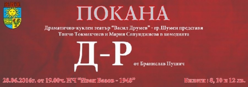 На 28 юни от 19 часа на сцената на НЧ "Иван Вазов - 1948" ще гостува Драматично-куклен театър "Васил Друмев" - гр. Шумен. Представлението, което ще бъде поставено на сцената в Костинброд е комедията "Д-р" от Бранислав Нушич, с участието на Тончо Токмакчиев и Мария Сапунджиева.