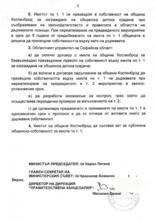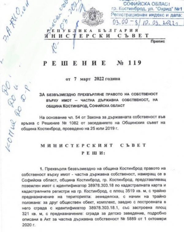 Държавата предостави на община Костинброд имот за детска градина в индустриалната зона на града. За това съобщават от Общината: