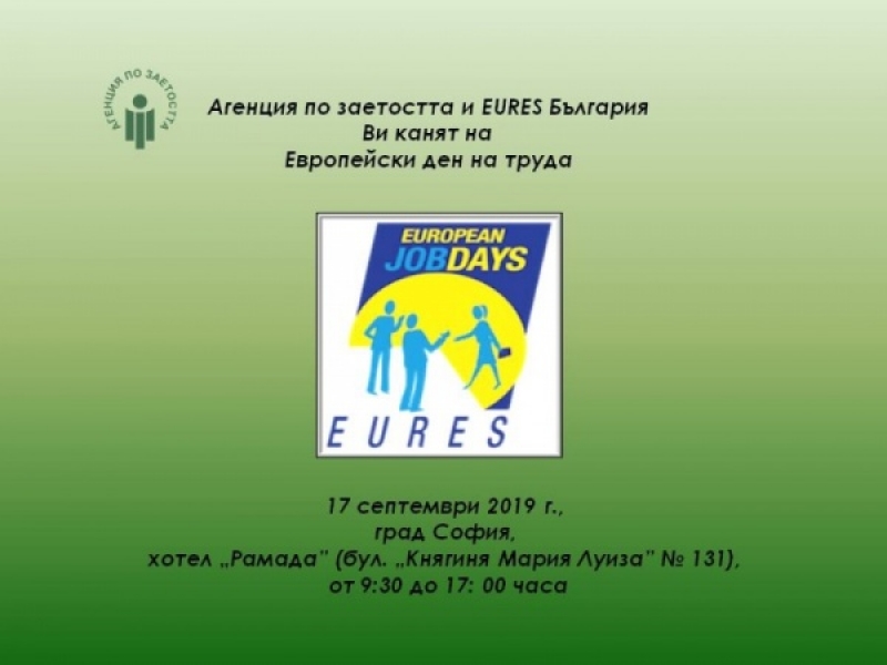 Агенция по заетостта организира международна трудова борса на 17 септември 2019 г. в град София. Европейският ден на труда ще се проведе в хотел „Рамада” (бул. „Княгиня Мария Луиза” № 131) от 9:30 до 17:00 часа. Събитието се провежда във връзка с изпълнението на проект „Национална EURES мрежа”, информират от Агенцията.