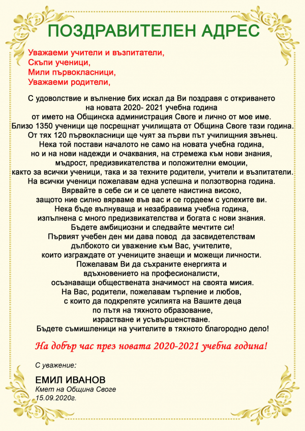 Успешна и плодотворна нова учебна година пожела кметът на Своге Емил Иванов на всички ученици, учители и родители по повод първия учебен ден. Приветствието е публикувано на официалния сайт на общината. Ето и пълният текст: