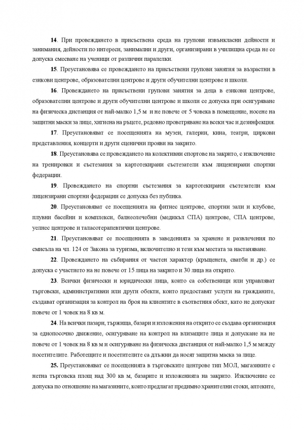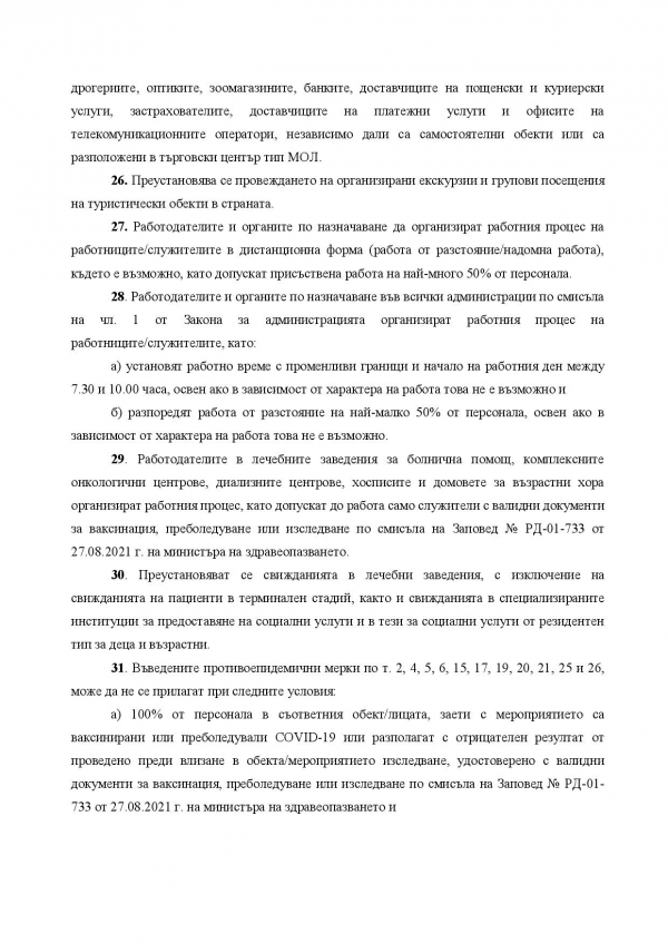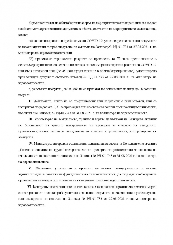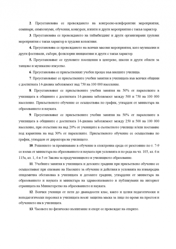 Министерството на здравеопазването публикува заповедта за новите противоепидемични мерки, които влизат в сила от 21 октомври. Здравният министър Стойчо Кацаров обяви по-рано във вторник на брифинг новите противоепидемични мерки.