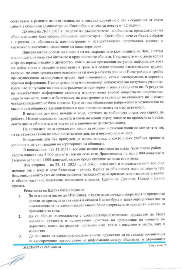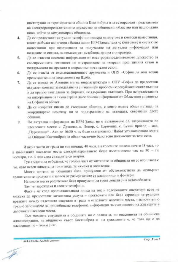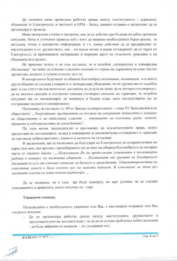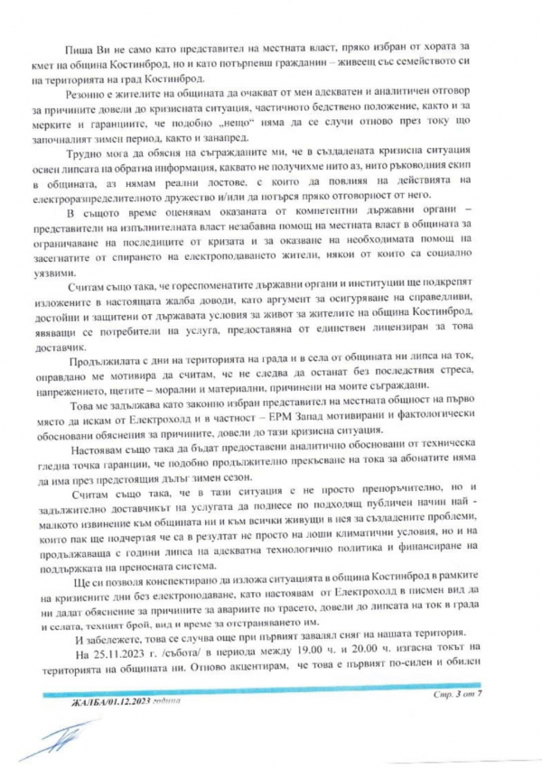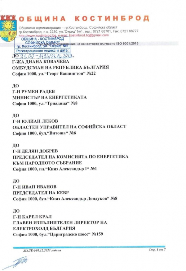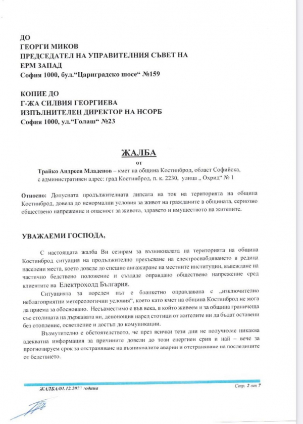 Жалба от кмета на община Костинброд до всички компетентни институции, относно продължителната липса на ток и до Националния омбудсман на Република България, Диана Ковачева.
