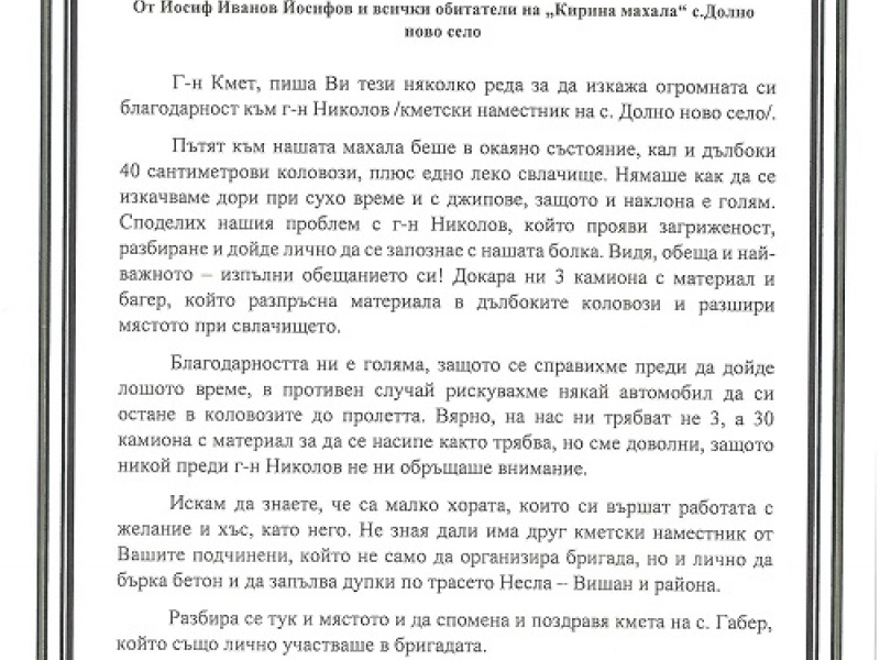 Г-н Кмет, пиша Ви тези няколко реда, за да изкажа огромната си благодарност към г-н Николов (кметски наместник на с. Долно ново село).
