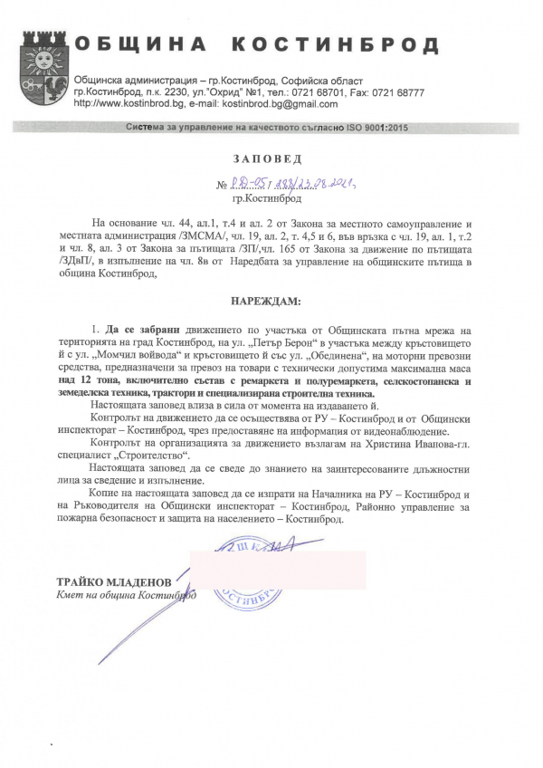 Община Костинброд публикува на официлния си уебсайт Заповед №РД-05-288/23.08.2021:
