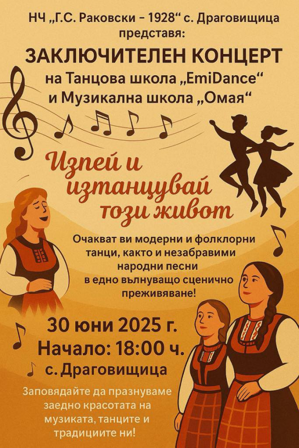 На 30 юни от 18:00 ч. в НЧ „Г.С. Раковски – 1928“ в село Драговищица ще се състои тържествен заключителен концерт на танцова школа „EmiDance“ и музикална школа „Омая“.
