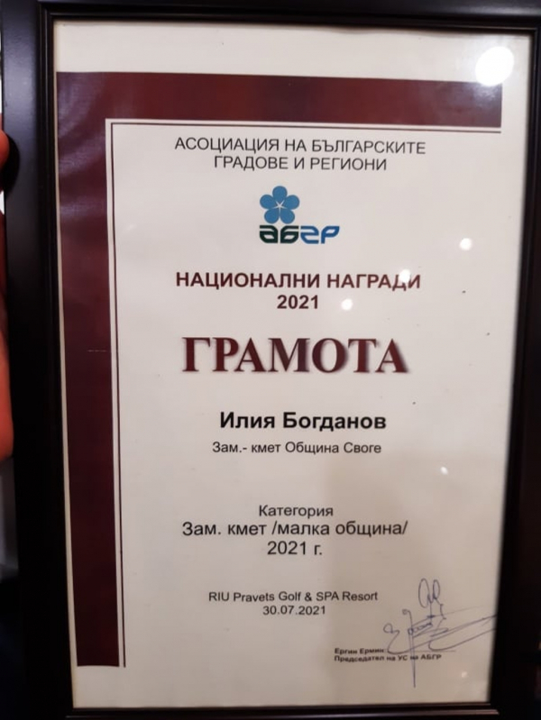 Заместник-кметът на община Своге - Илия Богданов бе удостоен с приз от Годишните награди на Асоциацията на българските градове и региони. Той спечели отличието в категория „Заместник кмет“, за малка община.