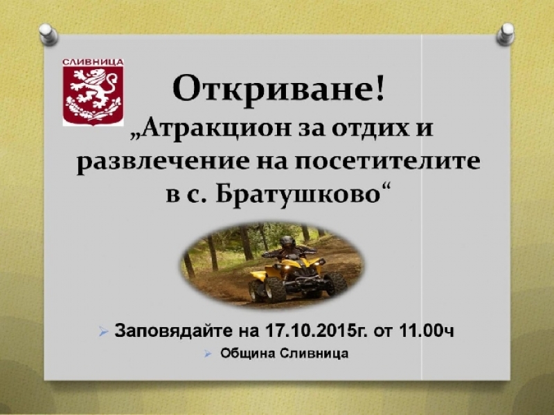 На 17.10.2015г. (събота) от 11.00ч. ще се състои откриването на проект „Атракцион за отдих и развлечение на посетителите в с. Братушково“ - офроуд писта.