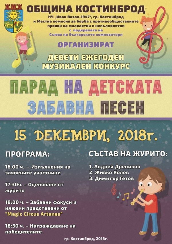 Парадът на детската забавна песен ще се проведе на 15 декември в Костинброд. Той има за цел да издирва и подкрепя талантливи музикални изпълнители на възраст от 3 до 16 години и да популяризира творческите им постижения.