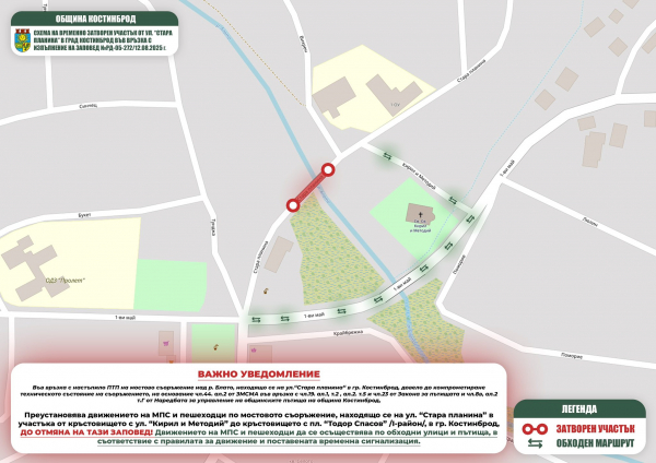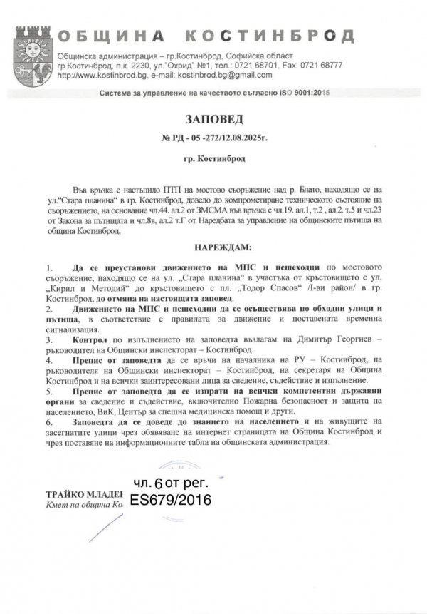 Според официалната заповед № РД-05-272/12.08.2025 г., подписана от кмета на община Костинброд – Трайко Младенов, движението по моста се преустановява до отмяна на настоящото разпореждане. Затварянето се отнася за участъка на ул. „Стара планина“ от кръстовището с ул. „Кирил и Методий“ до кръстовището с площад „Тодор Спасов“ в първи район на града.