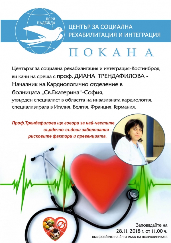 За най-честно срещаните сърдечно-съдови заболявания, превенцията и рисковите фактори ще разкаже на жителите на Костинброд проф. Диана Трендафилова - началник на Кардиологично отделение в болница „Света Екатерина“, гр. София Тя ще гостува в града по покана на Центъра за социална интеграция и рехабилитация „Надежда“.