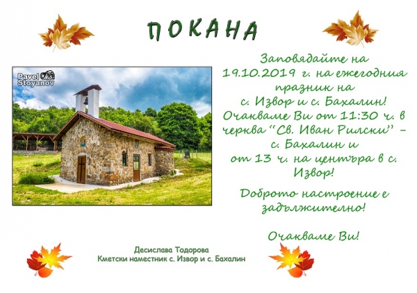 За поредна година сливнишките села Извор и Бахалин ще отбележат съвместно своя празник. По традиция събитието ще се проведе в деня на Свети Иван Рилски - 19 октомври (събота).