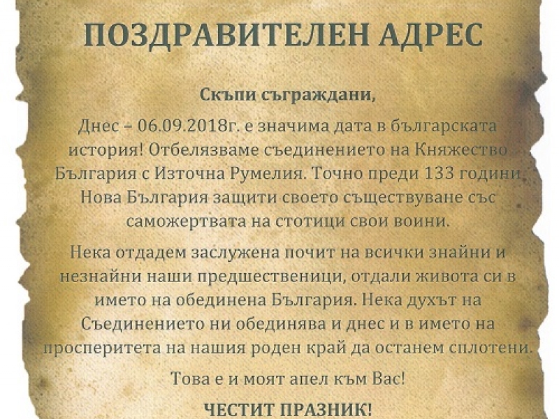 Нека духът на Съединението ни обединява и днес и в името на просперитета на нашия роден край да останем сплотени.